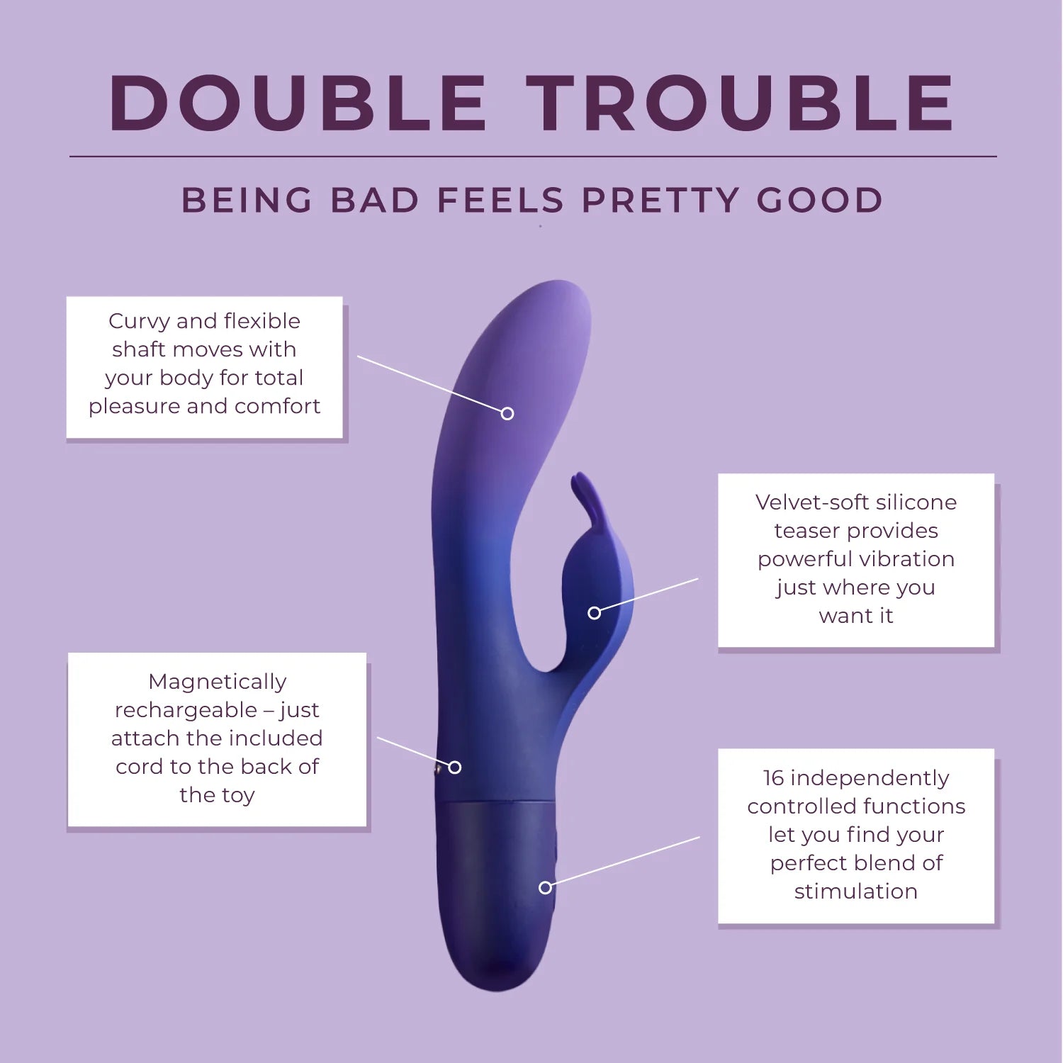 WHO DOESN’T LOVE A LITTLE DRAMA? WELL, PREPARE FOR TROUBLE…AND MAKE IT DOUBLE. THIS FLEXIBLE DUAL-ACTION VIBE WILL GIVE YOU A DOUBLE DOSE OF IRRESISTIBLE PLEASURE WITH INDEPENDENTLY CONTROLLED MOTORS IN THE SHAFT AND CLITORAL TEASER. EACH MOTOR BOASTS 8 PROGRESSIVE SPEEDS OF VIBRATION FOR A TOTAL OF 16 MIX-AND-MATCH WAYS TO STIR UP A LITTLE BEDROOM DRAMA.