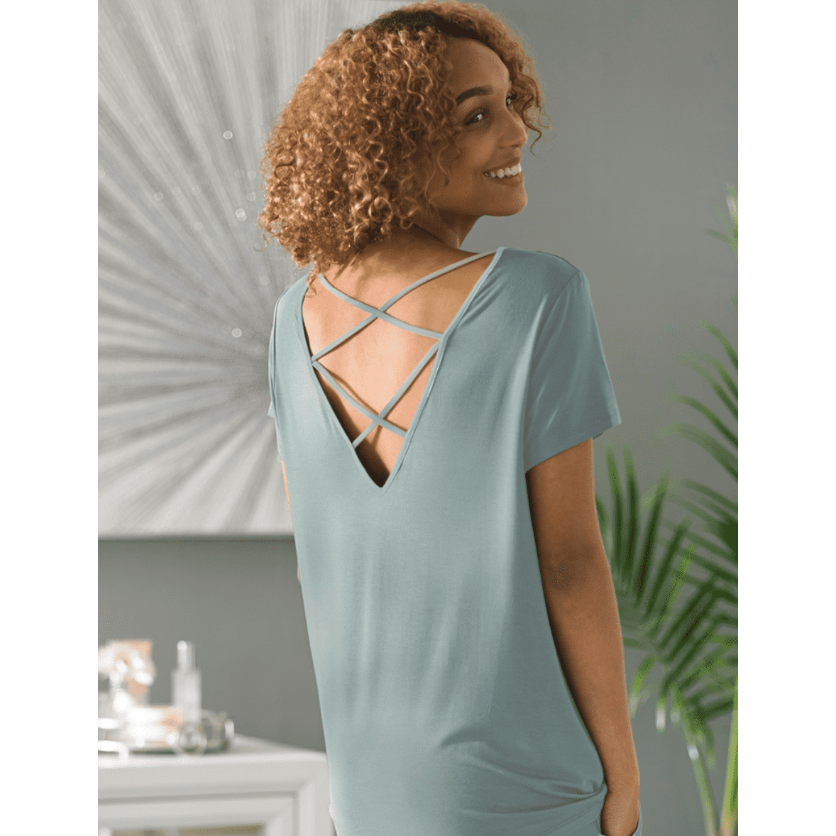 Comfort is sexy, especially in the Euforia Leto Cutout tee. This luxurious blend of bamboo fibers drapes easily over curves. The spun fibers are silky to the touch and wick away moisture, leaving you blissfully comfortable and confident. The low-key style comes in a variety of sizes and offers peeks of skin through the seductive plunging back and criss-cross straps for small touches of subtle sexiness. Pairs well with Sunday mornings, satisfied desires, and the Leto Lounge Pants.