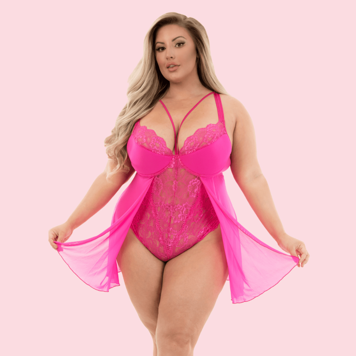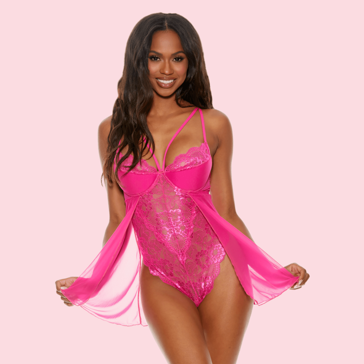 Pink isn’t just a color, it’s an attitude—so step into this two-in-one piece and don’t hold back. With gorgeous, curve-hugging lace and a flattering mesh overlay, teddy meets babydoll in a hot style you’ll want to wear night after night.